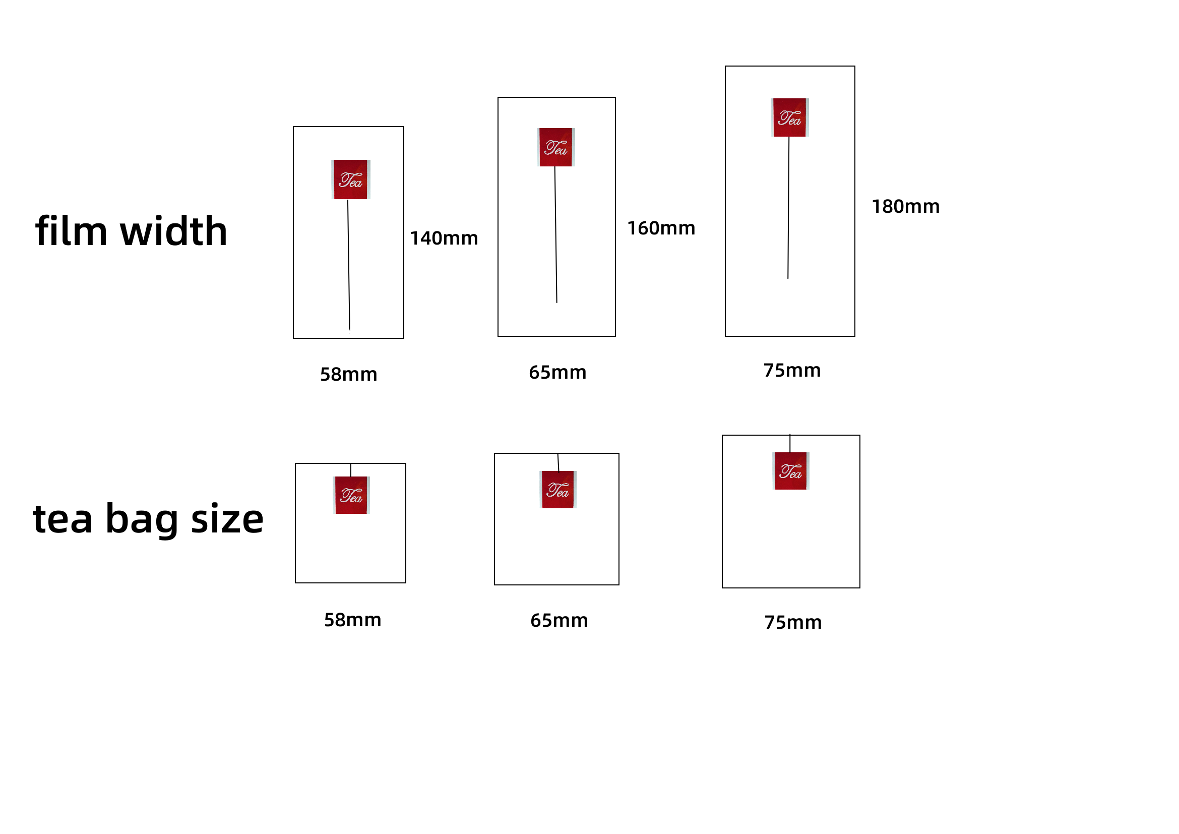 Pokud se obáváte přizpůsobitelnosti stroje, poskytneme bezplatnou vzorovou službu a přepravu bude zaplaceno kupujícím. Obecná velikost prázdného čajového sáčku je 5,8 * 7 cm /6,5 * 8 cm /7 * 9cm a obecná velikost stočeného materiálu je 140 /160 /180 mm. Pro jiné velikosti se obraťte na naše prodejní personál.